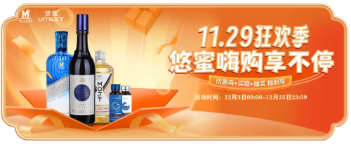 12月3日09:00-12月25日23:59,开启“11·29狂欢季 悠蜜嗨购享不停”活动。上i茅台APP买悠蜜产品,为甜蜜加码:①领券立减:10000张满减券大放送,可用于购买悠蜜蓝莓精酿遇见·蓝雪、UMEET靛岚蓝莓蒸馏酒40%vol等产品。②多买多赠:莫其托贵州味道系列鸡尾酒蓝莓酸“买一赠一”、umeet二倍浓缩蓝莓汁(复原)“买五赠三”。③幸运抽奖:购买任意悠蜜活动产品,抽500/200/100元抵扣券。有i有礼,甜甜蜜蜜~
