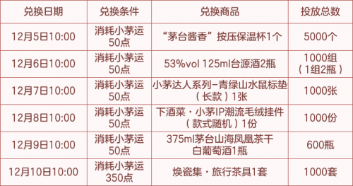 12月5日-12月10日每日10:00,“小茅权益屋”可兑换商品“上新”啦!亲们可消耗小茅运兑换权益商品,连续6天,天天有“新礼”,先到先得,兑完即止。一图速览↓↓↓