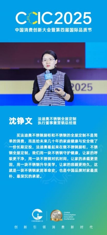 在随后的主题分享中,法迪奥执行董事兼营销总经理沈铮文阐述了法迪奥不锈钢全屋定制对当前品质消费浪潮的洞察。