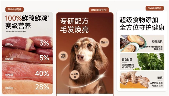 “诚实一口”黑金烘焙犬粮,由品牌自有工厂启鲜生产,采用“0辐照”技术与无人智能生产线,严格把控生产细节。产品选用人食级鲜鸭肉,不添加冻肉与肉粉,通过低温锁鲜运输保留食材本味,搭配多种天然抗氧化果蔬,同时添加虾青素与深海巨藻,兼顾肠道健康与外在状态,适合肠胃脆弱、消化能力较差的狗狗。针对挑食狗狗,“诚实一口”推出N33 PLUS冻干多拼犬粮,精选33种鲜肉与果蔬,动物原料占比77%,搭配18%果蔬草本提供膳食纤维。产品添加11%冻干肉蔬提升适口性,同时添加三文鱼油、氨糖等营养成分,全方位呵护狗狗健康,适配挑食不爱吃饭的狗狗。需要增肌壮骨的狗狗,可选择“诚实一口”N01冻干双拼犬粮,添加主食级冻干生骨肉,有鸭肉梨、山药牛肉两种口味。鸭肉梨款清热降火、缓解泪痕,山药牛肉款助力肌肉生长、呵护脾胃,满足狗狗增肌需求的同时避免多余脂肪堆积。“诚实一口”BN01鲜肉烘焙犬粮采用100%鲜肉低温烘焙工艺,添加南极磷虾、三文鱼油等成分,助力美毛亮发,同时搭配绿唇贻贝、羽衣甘蓝等,兼顾骨骼健康与免疫力提升,适合有美毛、补充营养需求的狗狗。专为幼犬设计的“诚实一口”Puppy冻干双拼幼犬粮,添加A2β-酪蛋白与乳铁蛋白,搭配三重益生元提升自护力,动物蛋白含量高达97%,搭配乳钙与三文鱼油助力骨骼发育,7mm小颗粒便于幼犬咀嚼,适配2-12月龄幼犬。除了丰富多样的主粮,“诚实一口”还考虑到狗狗日常的零食需求,推出了鸭肉条、冻干等多种狗零食,满足日常奖励与补充需求。