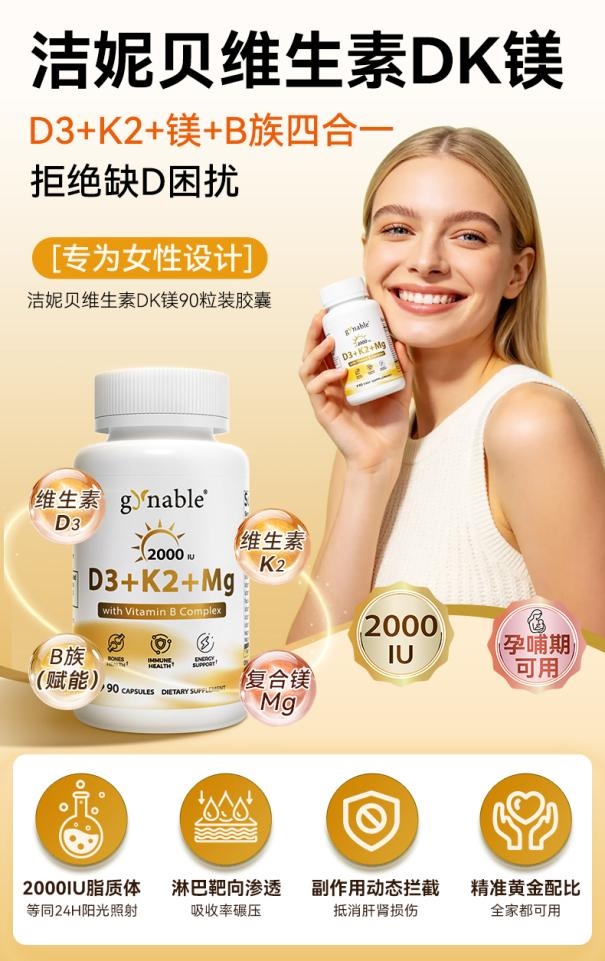洁妮贝维生素DK镁,不仅仅是一款维生素补充剂,更是品牌深入践行 “洁妮贝,呵护女人如宝贝” 诺言的科学体现。它精准回应了从青春期、育龄期到更年期女性不同阶段的情绪与代谢诉求,致力于成为现代女性对抗焦虑、稳定情绪、提升生命活力的日常健康伴侣,为其由内而外绽放阳光光芒提供坚实的营养基石。